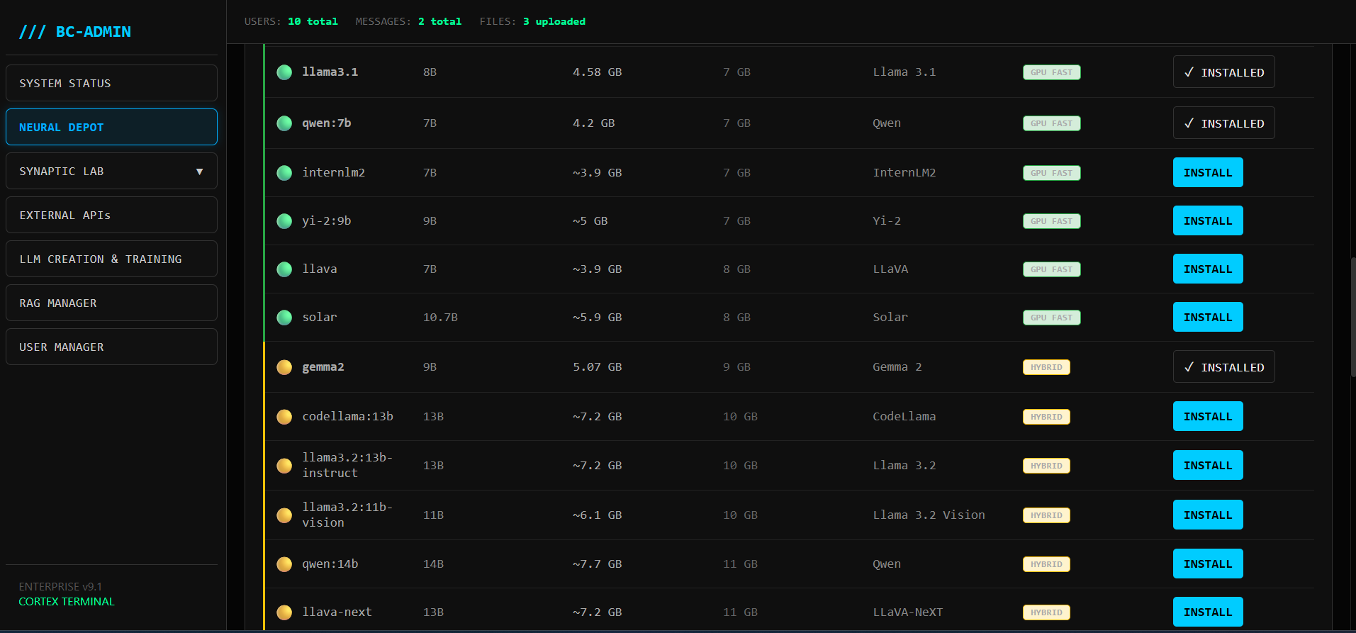 Platform KNOWS your hardware. Green models run. Yellow need more VRAM. Red are cloud-only. No guessing.
