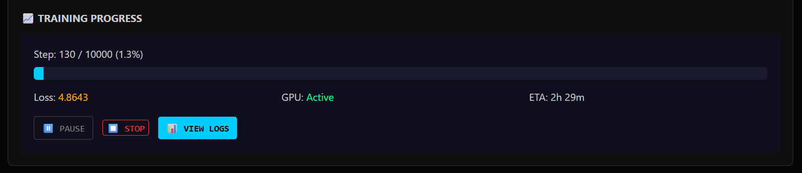 Upload dataset → Configure LoRA → Train Learning rate, batch size, max steps – full control.
